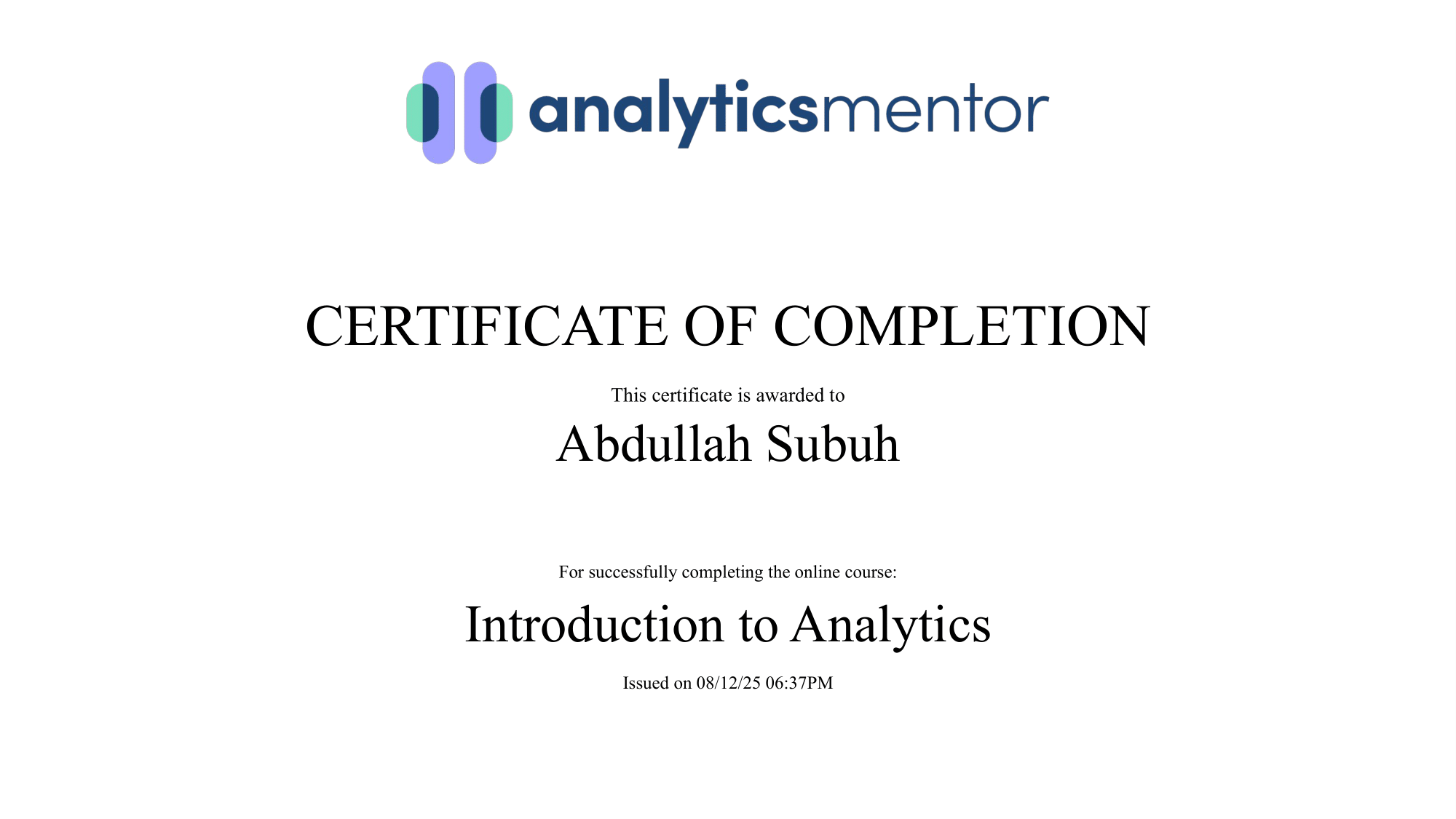 Certificate: Introduction to Analytics — Analytics Mentor Open Full-Size Certificate
